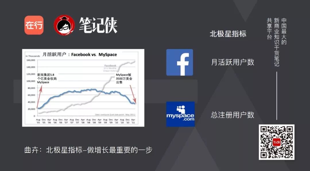 在Myspace里面,它们的北极星指标走的是注册用户数;而Facebook是月活跃用户数。