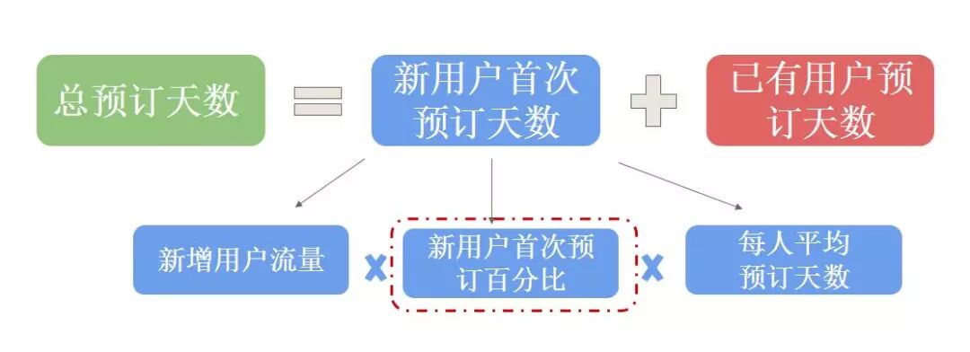 新用户的预定天数=新增用户流*多少人首次预定的比例*平均每个预定多少天。