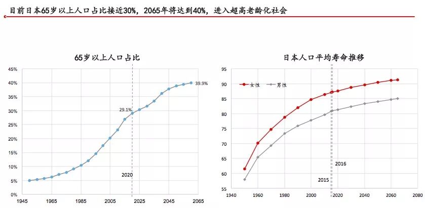 我们先来看看日本老龄化的情况。以 65 岁作为老龄人口线,从上图趋势看,2020 年的时候 65 岁以上人口将占比 29%,至 2065 年时,这一比例将上升到 40%。而目前中国的老龄人口占比是 15%,和 90 年代的日本相当。