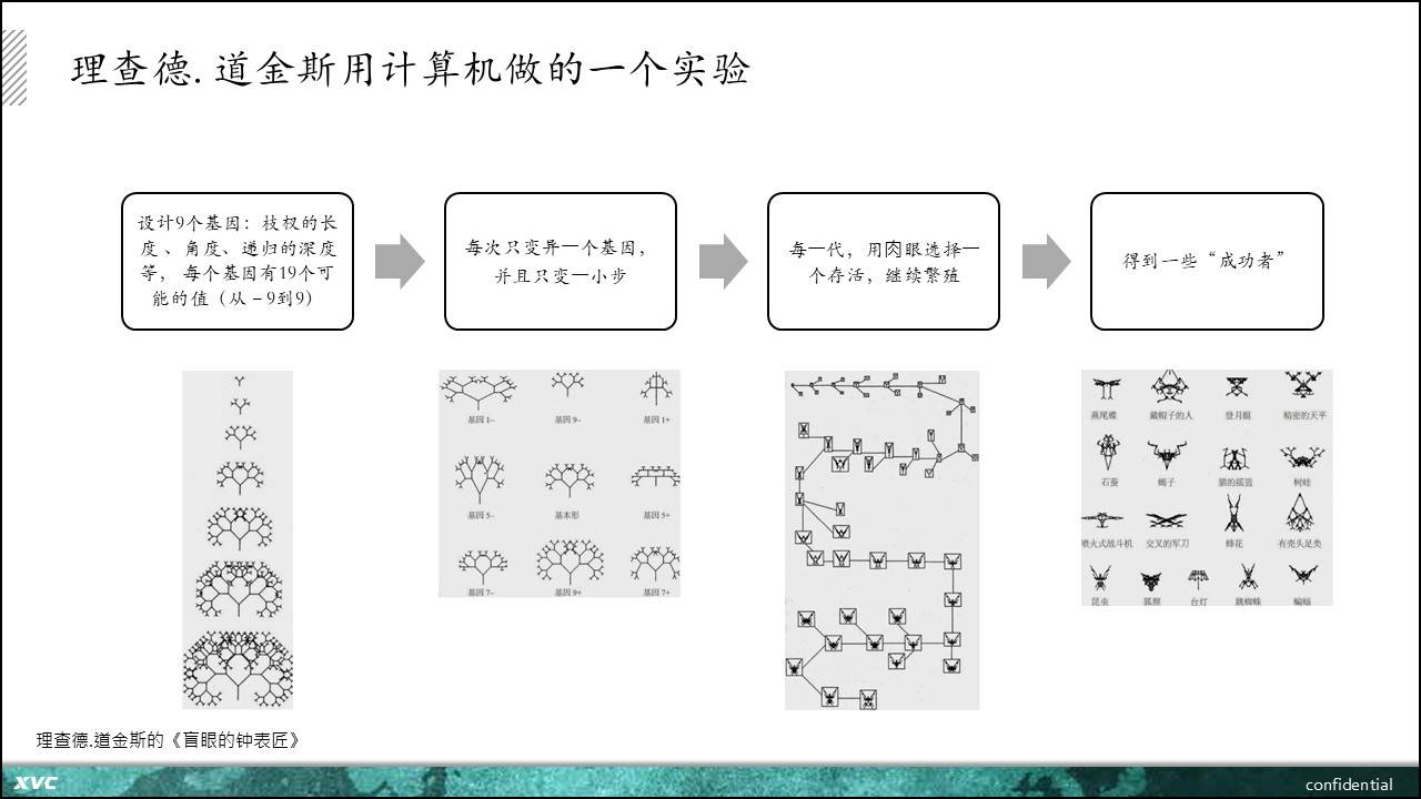 可以把它理解成:一个在“基因空间”里占据某个位置的小虫子,改一个基因,它的形状就会变。然后他模拟“演化”:从一个初始的小虫子开始,每一代让电脑生成8个“子代”,每个子代只改变一个基因——也就是小幅变异。