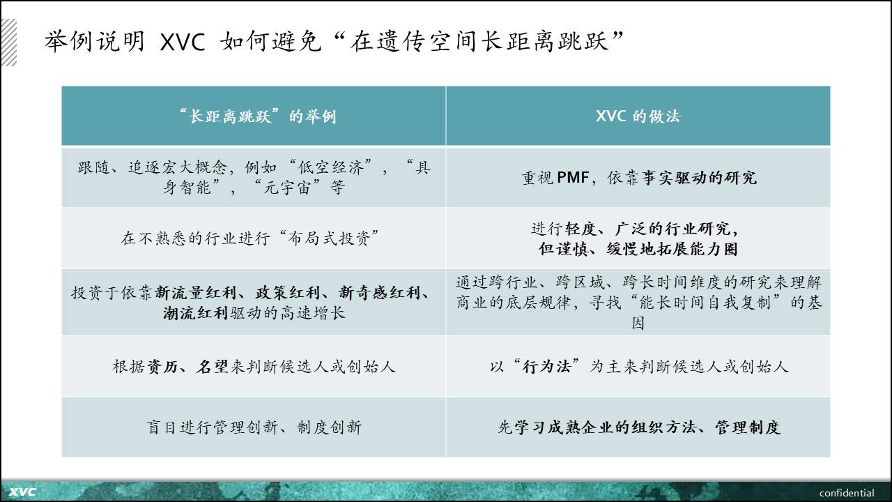 接下来,我想举几个对应的例子,说明在投资实践中,XVC 是如何刻意避免这种“长距离跳跃式”的决策方式的。