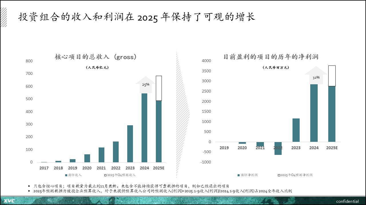第三,XVC 投资组合的合计收入和利润,双双再创新高。核心项目的合计收入预计比去年增长 25%,从 500 多亿人民币涨到接近 700 亿,盈利项目的合计利润预计比去年增长 32%,从28.5 亿人民币涨到约37.7亿人民币。